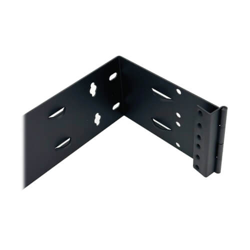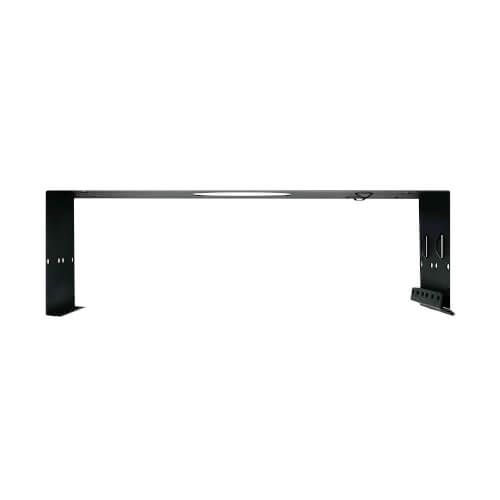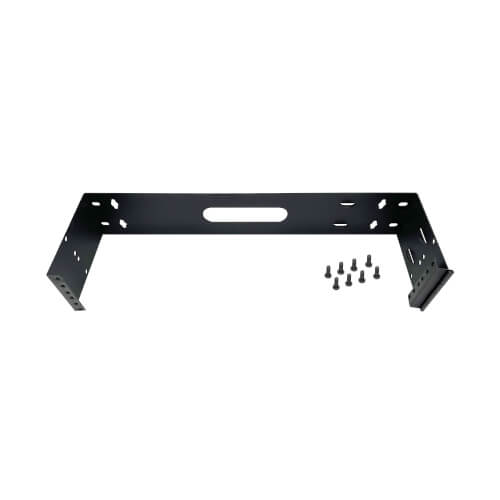 This heavy-duty 14-gauge-steel 2U wall-mount patch panel bracket is the ideal alternative to a full size rack. Standard EIA 19-inch width allows installation of any 19-inch patch panel. Laser-cut metal keeps all edges smooth, greatly reducing the possibility of injury and wear on cable jackets. Universal mounting for right or left hinging. Keyholes are spaced 16 inches apart for mounting on wall studs. Stamped horizontal reinforcement ribs allow for greater sturdiness and stability and allow the addition of a rear cutout for feeding cable through a wall opening. Smooth, glossy black finish.